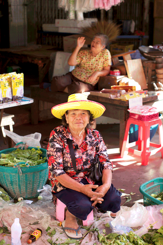 On décide de retourner à Pak Chong centre pour le reste de l’après midi. Greenleaf appelle un taxi pour nous. C’est en fait, un de ces employés qui nous emmènera. Ils proposent un aller et retour pour 300 bahts (7,50€). C’est « cher » mais nous acceptons. Le taxi nous déposera au Seven Eleven et nous dit de revenir ici absolument quand on a fini, qu’il nous attendra. Nous visitons le marché de Pak Chong, impressionant car les gens font surtout le marché en mobylettes, tous les produits sont très frais. Le marché de Pak Chong est très beau, le poisson et la viande sont très frais, les poissons sont encore vivants, comment font-ils sans aucun moyen de conservation ?