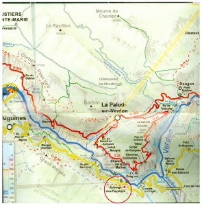 La veille de la randonnée, nous avons dormi à Salles sur Verdon, au camping La Source à 50 mètres du Lac de Sainte Croix.
