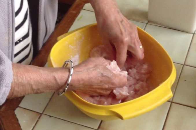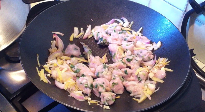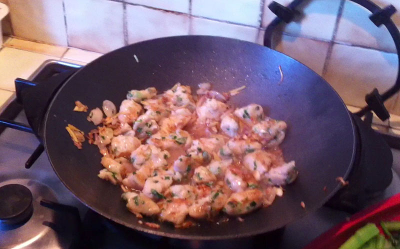 - Déposer les boulettes petit à petit dans le wok, au milieu de l’ail, des échalotes et du gingembre. Ajouter un peu d’huile. Si les boulettes formées sont trop grosses, ne pas hésiter à les couper en 2 avec les cuillères en bois. Il faut bien les faire dorer. Attention, il ne faudra pas trop les remuer au risque de les voir s’émietter, et comme dirait Amah « attention devenu miettes » ;-)