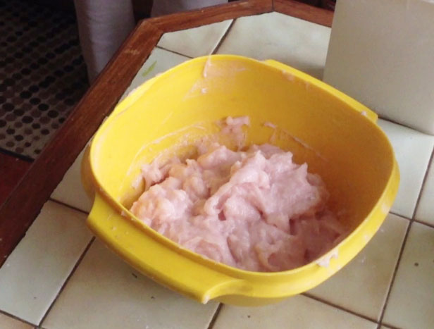 - Mixer le poisson et y ajouter un demi-sachet de poudre à lever, un peu de sel et 4 cuillères à soupe d’huile et 2 cuillères à soupe bombées de farine de manioc.