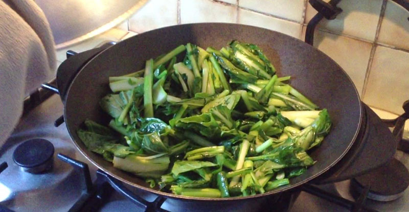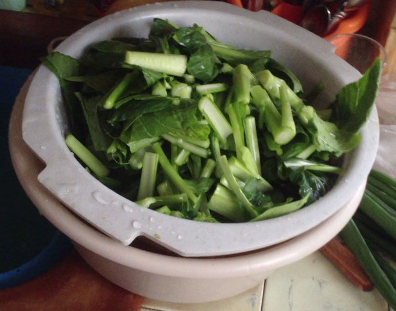 - Laver les légumes verts que vous aurez choisis. Si vous choisissez des brocolis, les faire cuire pendant 15 mn à la vapeur puis coupez les en morceaux quand ils sont refroidis. Si vous choisissez les brèdes ou le pak choï, il est inutile de le cuire avant. Pour cette recette, c’était des brèdes mafane.