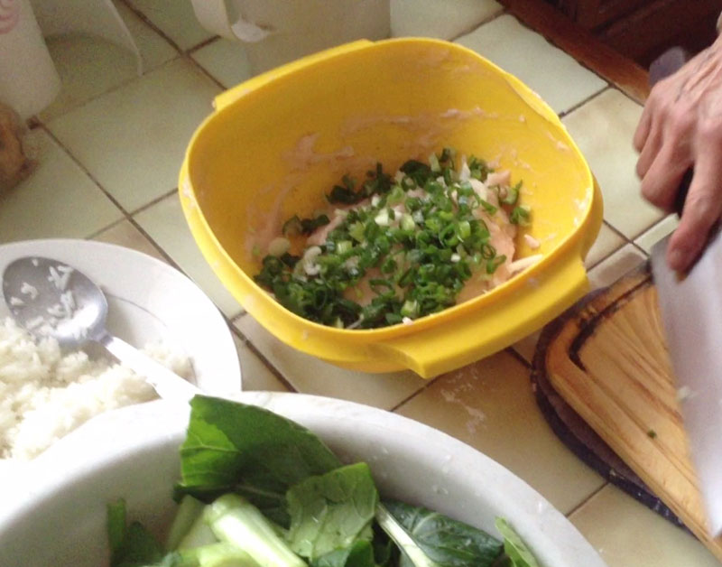 - Couper 2 grosses cébettes (ou ciboulette) en fines lamelles et les ajouter au poisson mixé
