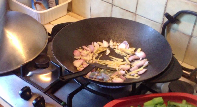 - Y ajouter l’ail, l’échalote et le gingembre, faire cuire ensemble quelques minutes en ajoutant un peu d’huile.