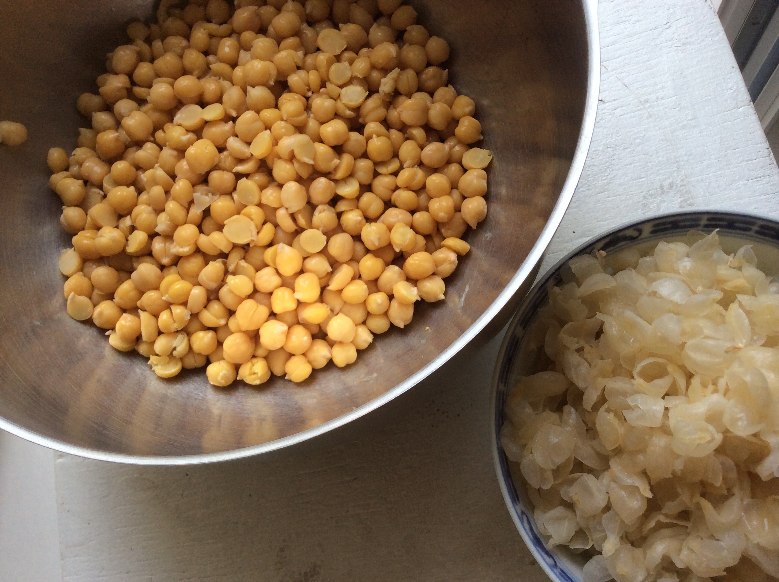 - Les égoutter, conservez une tasse d’eau de trempage (ne le faites pas si vous cuisez au vitaliseur), laisser tiédir et enlever chaque peau de pois chiche, c’est un peu long, environs 45 mn pour cette recette, mais ça se fait bien. Il faut presser le pois chiche entre le pouce et l’index (cette étape est néanmoins facultative)