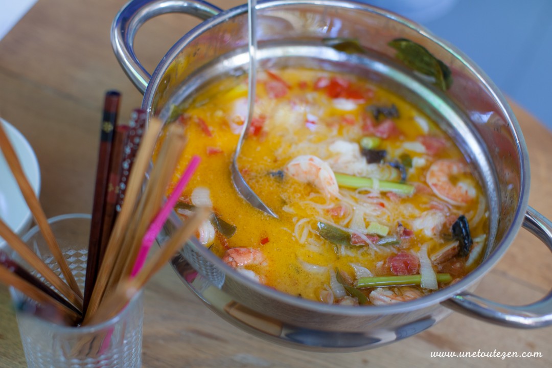 La recette de la soupe thaï m’a été transmise par une Thaïlandaise et je l’ai légèrement adaptée avec les cours de cuisine que j’avais pris en Thaïlande et mes gouts personnels.