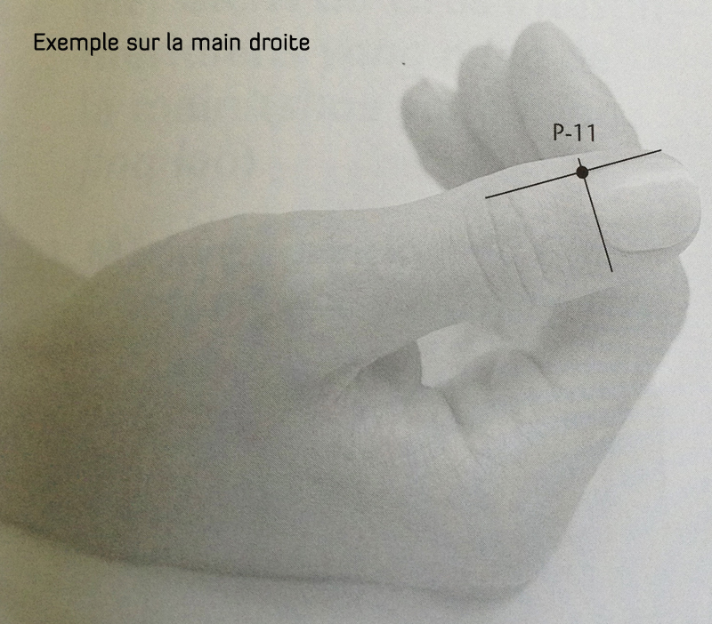 Ce point 11 Poulon est le point Ting du poumon et le point de sortie d’énergie. Le point ting attire l’énergie perturbée à l’extrémité du méridien. En général, quand on est malade, c’est le poumon qui prend, on a la gorge qui chatouille (le méridien du poumon à une branche interne qui va à la gorge), on tousse, on sent que ça attaque les bronches, etc.