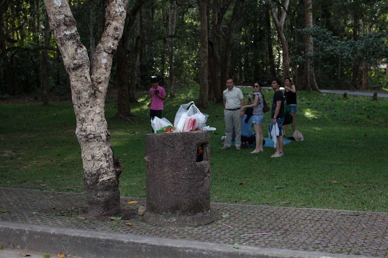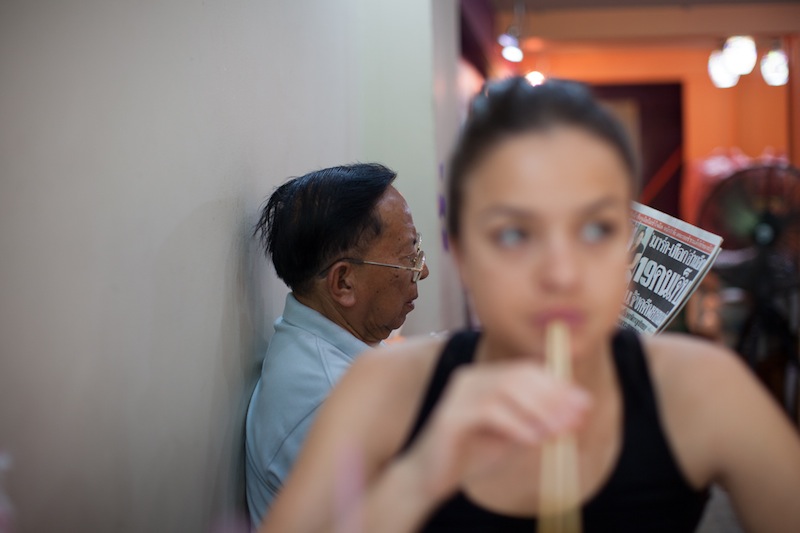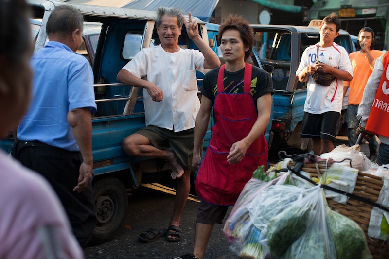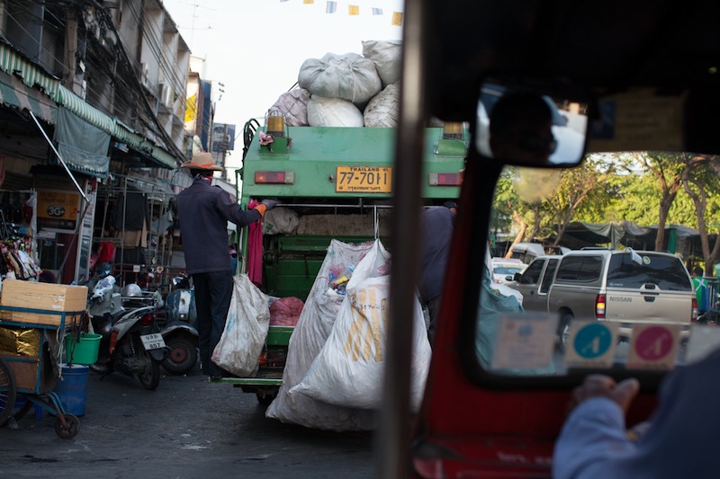Yves qui prend une poubelle en photo ! il me dit ensuite que ce n’est pas tellement la poubelle qui l’intéresse sur cette image, c’est l’attention intrigante des yeux rivés des Thaïlandais à son égard.