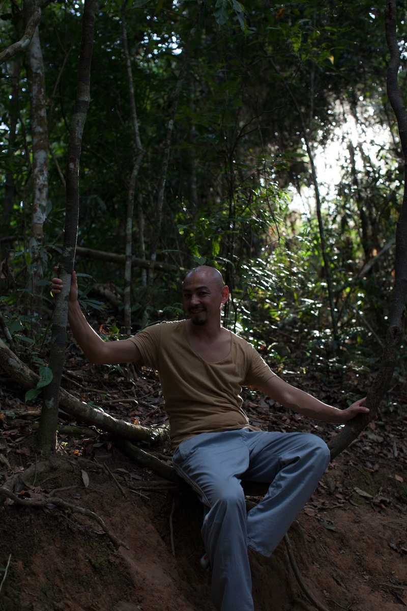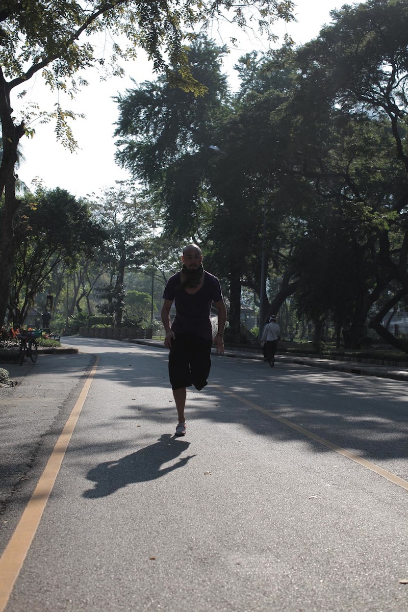Nous sommes sous un énorme arbre, allongés sur la pelouse, c’est formidable ! Il est drôle de voir qu’ici le sport n’est pas si rigide que nous. Nous regardons un homme qui court. Il court d’une façon étrange (pour nous occidentaux), il bouge autrement, les bras le long du corps et étant face au soleil, comme s’il captait le soleil en sautillant, on pourrait le prendre pour un fou mais ici, tout le monde le salue comme s’il était un grand maitre !