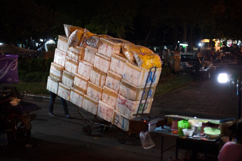 On teste notre 1ere soupe thaï dans un petit resto où on a vu beaucoup de thaï y manger, c’est ultra pimenté mais très bon. La vie suit son court dehors. Une femme fait de la couture sur le trottoir, des petits marchands ambulants sont a tous les coins de rue. La ou nous avons été surpris, c’est avec le livreur de bouteilles de gaz. Il a environs 10 grosses bouteilles a l’avant de sa mobylette ! S’il avait un choc avec un véhicule, il explose ! Autre chose étonnante, en se promenant dans la rue, on rentre dans la vie privée des thaï. Leurs maisons sont ouvertes sur la rue, et la rue est le prolongement de leur habitation ou ils entreposent pas mal de choses, on voit tout ce qu’ils font. Au départ, je pensai qu’ils vendaient certaines choses mais je n’arrivai pas a savoir quoi, jusqu’à ce que je me rende compte que certains ne vendent rien ! Ils vivent là et attendent dans la rue. Les odeurs sont assez fortes selon les rues. Ce que l’on a compris est que les asiatiques essaient de combler le moindre espace, même le plus petit, c’est très chargé.