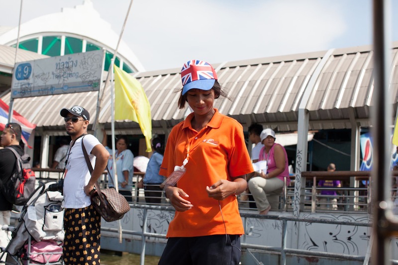 On achète 2 tickets (on peut aussi acheter le ticket à bord du bateau), c’est bien indiqué et écrit a la fois en thaï et en anglais, on paie 30 bahts pour 2 (0,75€) pour aller jusqu’a l’arret Sapan Taksin.