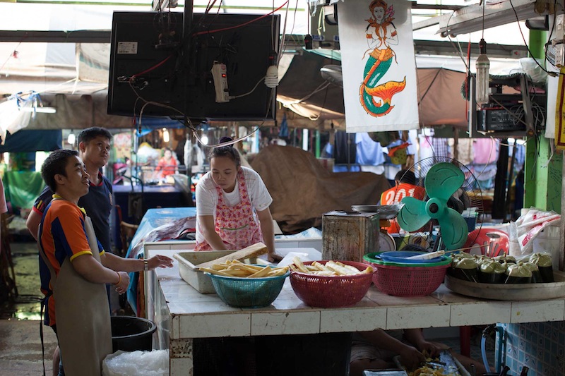 Le matin, nous décidons de faire le marché de gros Pahurat. On se lève tot et on prend le métro (arrêt de métro : Klong Toei). On arrive à 7h30 au marché. Les odeurs sont saisissantes, parfois violentes ! Il faut éviter d’y aller en tongs car le sol est plein de déchets de poissons, etc. Ici, les thaïs préparent des découpes de viandes, de poissons, que les restaurateurs viennent acheter.