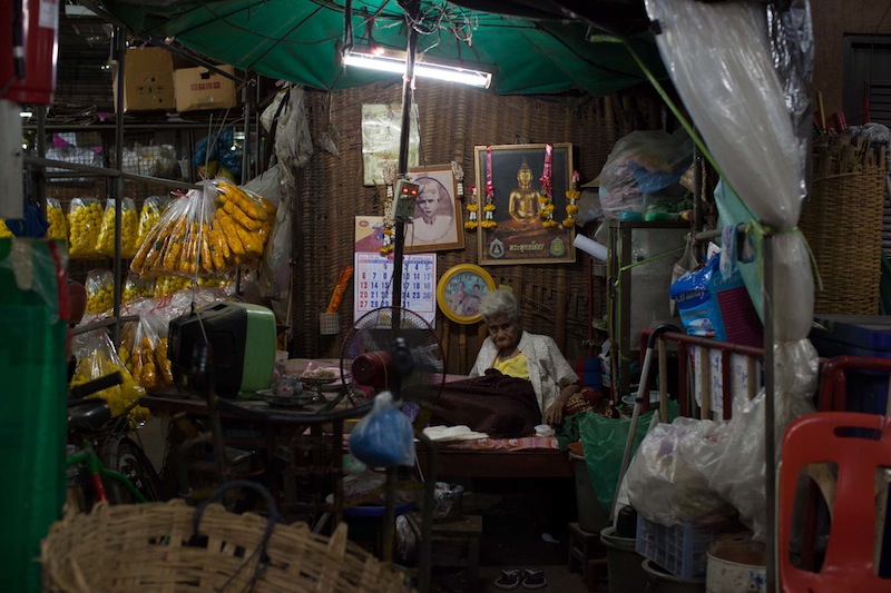 Pour notre dernière soirée, on va au marché aux fleurs Pak Khlong. Il faut prendre le bateau jusqu’à Saphan Phut, mais le bateau ne fonctionne pas le soir, nous prendrons donc le tuk tuk. Il y a milles senteurs de fleurs, partout, les fleurs sont travaillées, on les coupe, les tressent pour en faire des offrandes, on les emballe. C’est très animé.