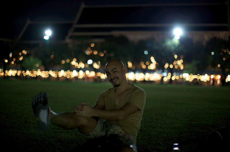 Nous partons le soir en direction de la grande pelouse Sanamluang. Sur le chemin, on entend une messe bouddhique. On rentre à l’intérieur du temple, des chaises sont installées partout, au dessus de chaque chaise sont installées des petits bouts de ficelles avec des nœuds. Nous avions vu cela également à Wat Pro sans savoir à quoi cela servait… Les thaïlandais nous invitent à nous asseoir avec eux et à prier. On découvre qu’il faut dénouer la ficelle et la mettre sur la tête. On imagine que c’est une façon d’être relié avec le ciel. C’est un grand bol de sérénité intérieure, il règne une atmosphère très zen et respectueuse associée à un grand respect. On en repart ressourcé.
